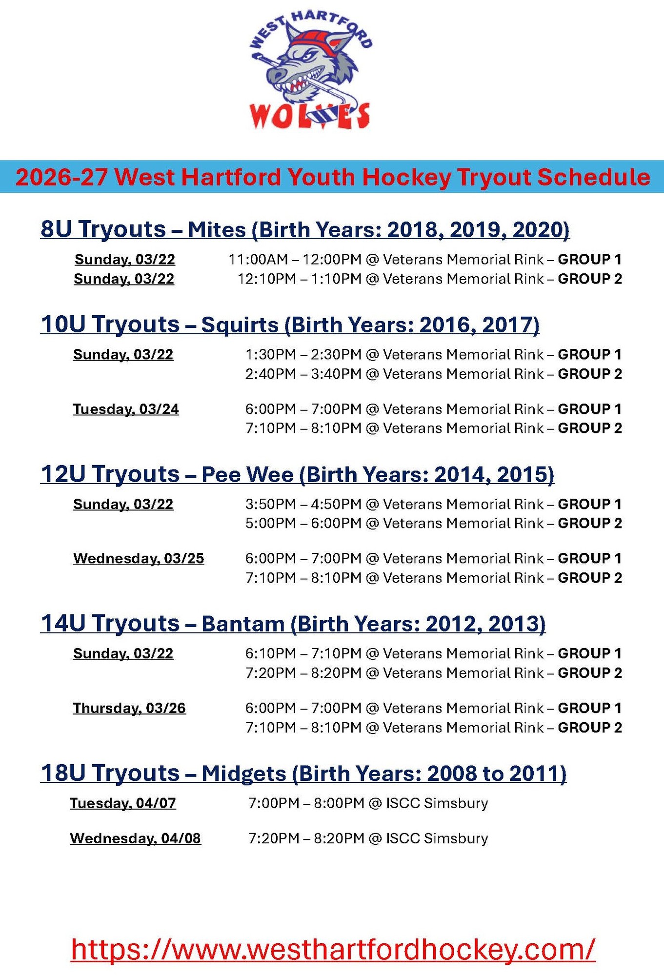 Tryout Registration NOW OPEN for the 2026-27 West Hartford Wolves Travel Hockey season!